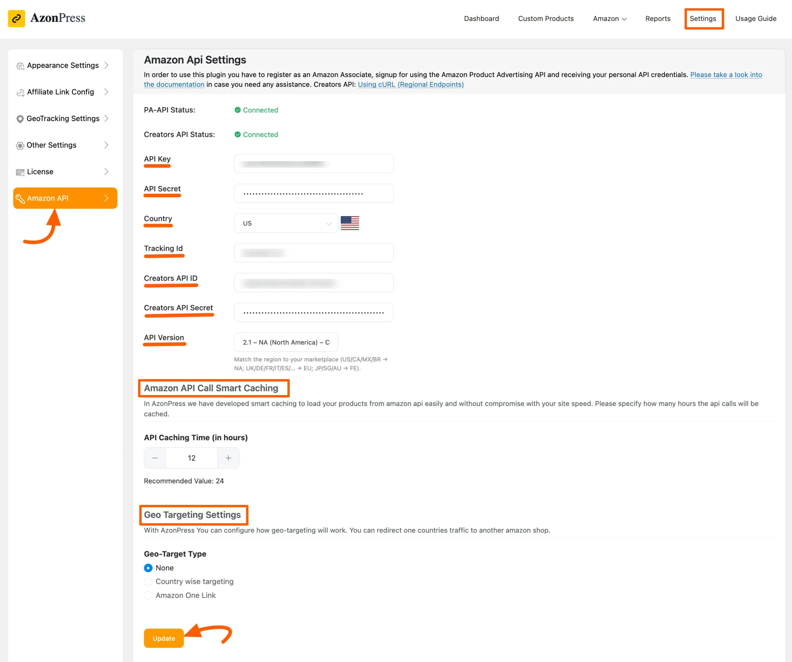 Once you have filled in all the required information, click the Update button to save your changes. Your Amazon API configuration is now complete!